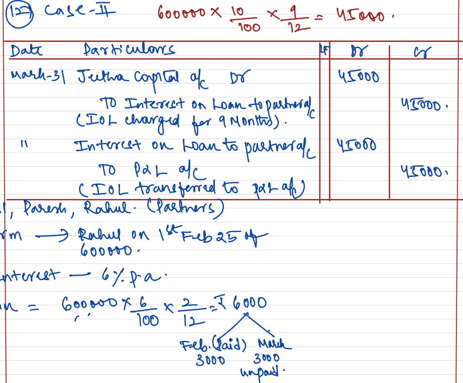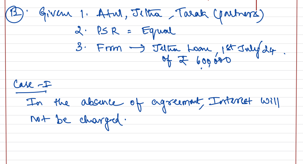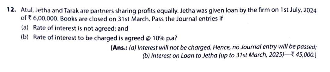Atul, Jetha, and Tarak are partners sharing profits equally. Jetha was given a loan by the firm on 1st July 2024 of ₹ 6,00,000. Books are closed on 31st March, What Journal entries will be passed if