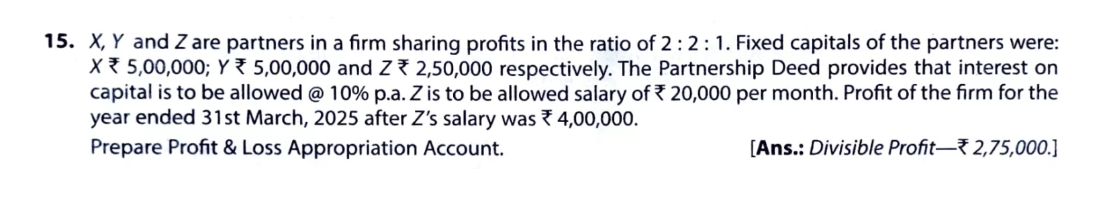 X, Y, and Z are partners in a firm sharing profits in the ratio of 2 : 2 : 1. Fixed Capitals of the partners were: X ₹ 5,00,000; Y ₹ 5,00,000 and Z ₹ 2,50,000 respectively. The Partnership Deed provides that interest on capital is to be allowed @ 10% p.a. Z is to be allowed a salary of ₹ 2,000 per month. Profit of the firm for the year ended 31st March, 2024 after Z’s salary was ₹ Prepare Profit and Loss Appropriation Account.