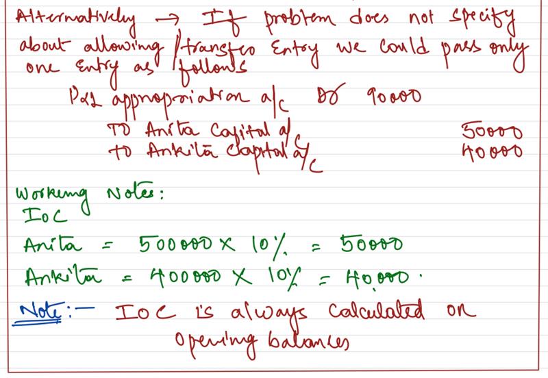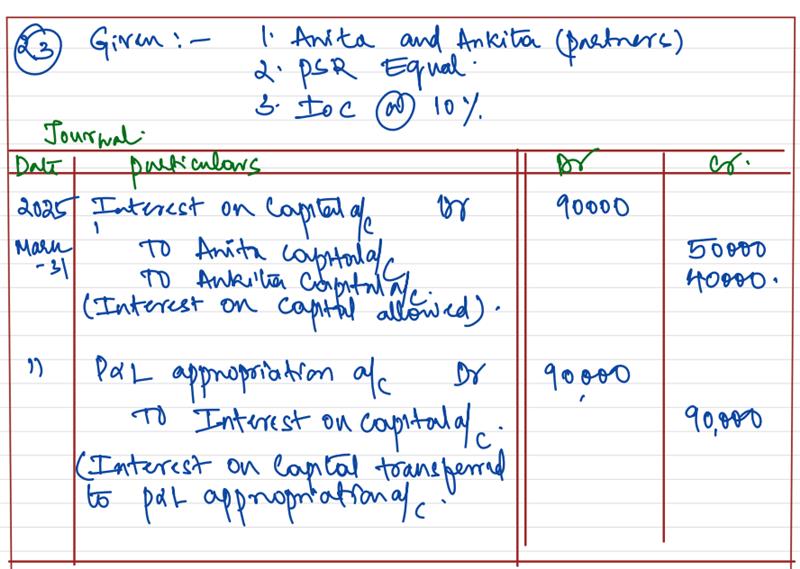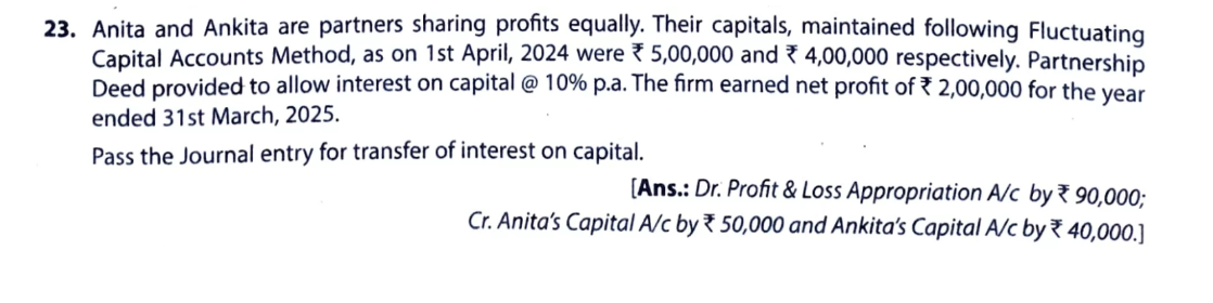 Anita and Ankita are partners sharing profits equally. Their capitals, maintained following Fluctuating Capital Accounts Method, as on 1st April 2023 were ₹ 5,00,000 and ₹ 4,00,000 respectively. Partnership Deed Provided to allow interest on capital @ 10% p.a. The firm earned a net profit of ₹ 2,00,000 for the year ended 31st March 2024.