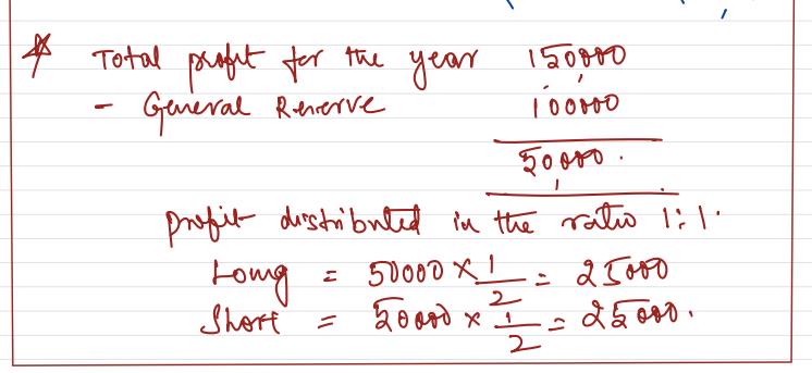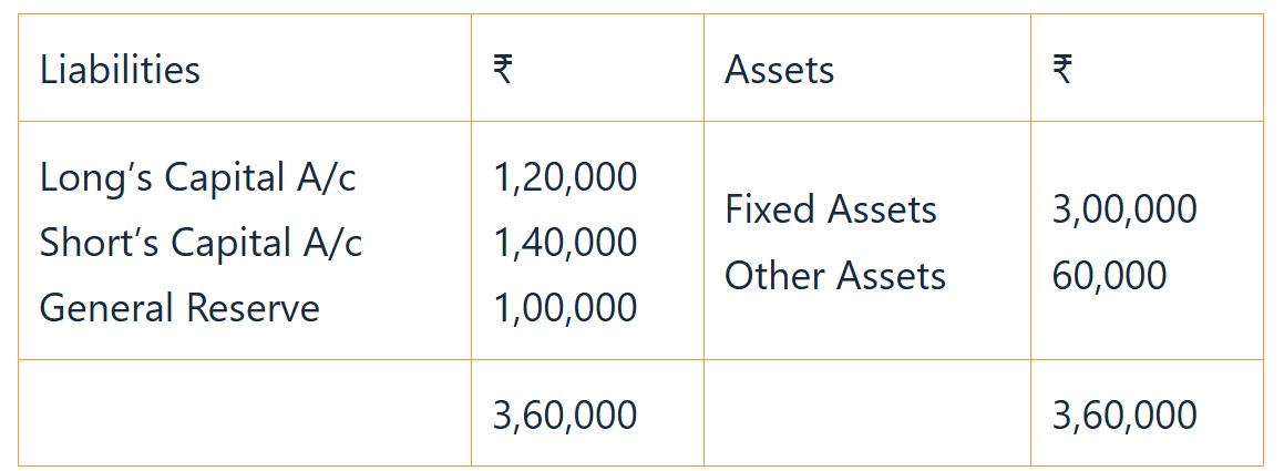 During the year, Long withdrew ₹ 40,000 and Short withdrew ₹ 50,000. Profit for the year was ₹ 1,50,000 out of which ₹ 1,00,000 was transferred to General Reserve.