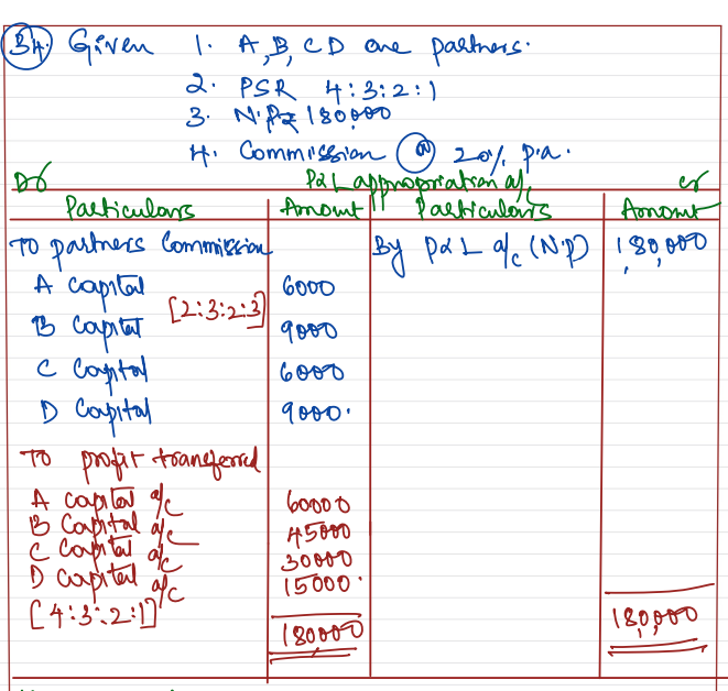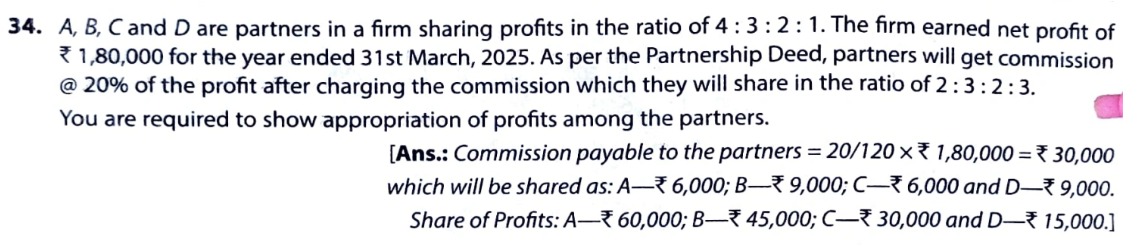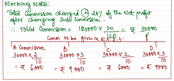 A, B and C, and D are partners in a firm sharing profits in the ratio of 4 : 3 : 2 :1. The firm earned a net profit of ₹ 1,80,000 for the year ended 31st March 2024. As per the Partnership Deed, partners will get a commission @ 20% of the profits after charging such commission which they will share as 2 : 3 2 : 3.