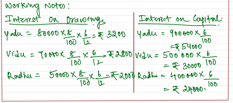 Yadu, Vidu, and Radhu were partners in a firm sharing profits in the ratio of 4 : 3 : 3. Their fixed capitals on 1st April 2018 were ₹ 9,00,000, ₹ 5,00,000 and ₹ 4,00,000 respectively. On 1st November 2018, Yadu gave a loan of ₹ 80,000 to the firm, as per the partnership agreement.