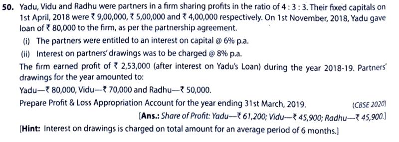 The firm earned a profit of ₹ 2,53,000 (after interest on Yadu’s Loan) during the year 2018-19. Partner’s drawings for the year amounted to: