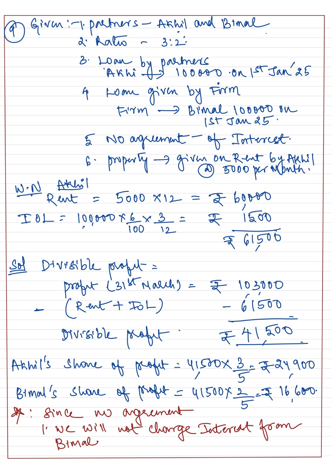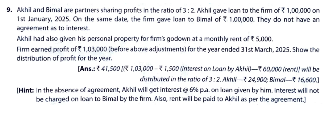 Akhil and Bimal are partners sharing profits in the ratio of 3 : 2. Akhil gave a loan to the firm of ₹ 1,00,000 on 1st January 2025. On the same date, the firm gave a loan to Bimal of ₹ 1,00,000. They do not have an agreement as to interest.
