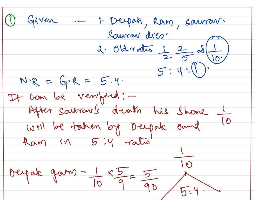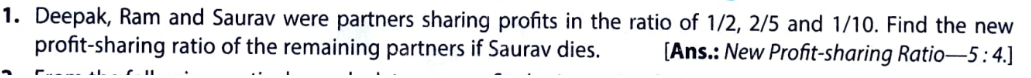 Deepak, Ram and Saurav were partners sharing profits in the ratio of 1/2, 2/5, and 1/10. Find the new profit-sharing ratio of the remaining partners if Saurav dies.