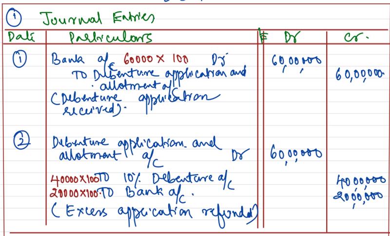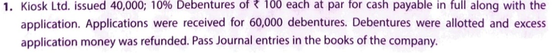 Kiosk Ltd. issued 40,000; 10% Debentures of ₹ 100 each at par for cash payable in full along with the application. Applications were received for 60,000 debentures. Debentures were allotted and excess application money was refunded. Pass Journal entries in the books of the company.