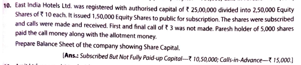East India Hotels Ltd. was registered with authorised capital of ₹ 25,00,000 divided into 2,50,000 Equity Shares of ₹ 10 each. It issued 1,50,000 Equity Shares to public for subscription. The shares were subscribed and calls were made and received. First and final call of ₹ 3 was not made. Paresh holder of 5,000 shares paid the call money along with the allotment money.