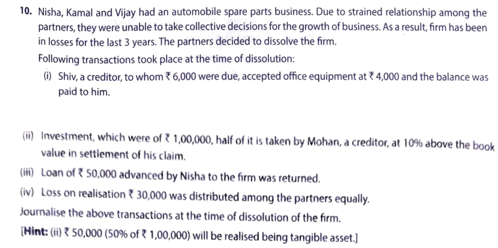 Nisha, Kamal and Vijay has an automobile spare parts business. Due to strained relationship among the partners, they were unable to take collective decisions for the growth of business. As a result, firm has been in losses for the last 3 years. The partners decided to dissolve the firm.