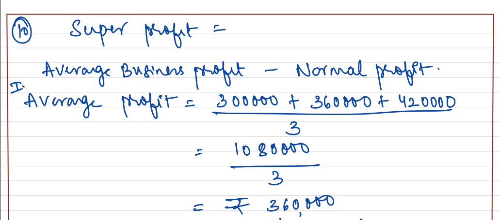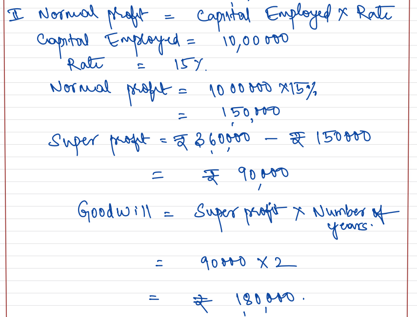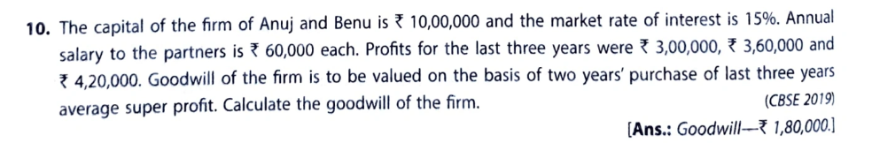 The Capital of the firm of Anuj and Benu is ₹ 10,00,000 and the market rate of interest is 15%. The annual salary of the partners is ₹ 60,000 each. The profit for the last three years were ₹ 3,00,000; ₹ 3,60,000 and ₹ 4,20,000. The goodwill of the firm is to be valued on the basis of two years’ purchase of the last three years’ average super profit. Calculate the goodwill of the firm.