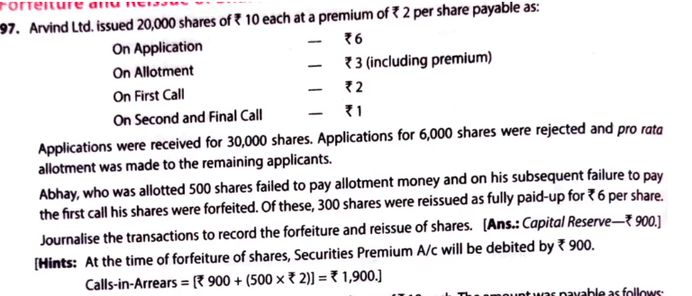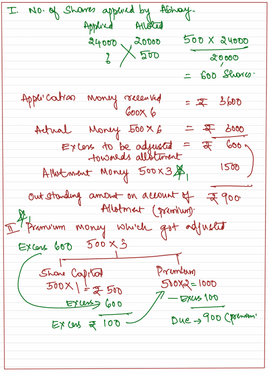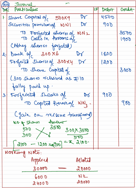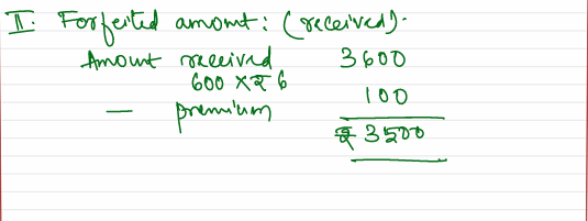 Abhay, who was allotted 500 shares failed to pay allotment money and on his subsequent failure to pay the first call his shares were forfeited. Of these, 300 shares were reissued as fully paid-up for ₹ 6 per share.