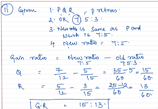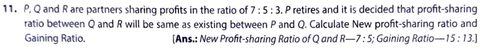 P, Q and R are partners sharing profits in the ratio of 7 : 5 : 3. P retires and it is decided that profit sharing ratio between Q and R will be same as existing between P and Q. Calculate New Profit sharing ratio and Gaining Ratio.