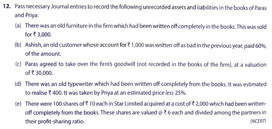 - There was 100 shares of ₹ 100 each in Star Limited acquired at a cost of ₹ 2,000 which has been written off completely from the books. These share are valued @ ₹ 6 each and divided among the partners in their profit sharing ratio.