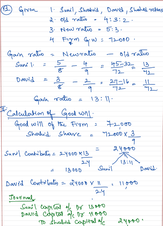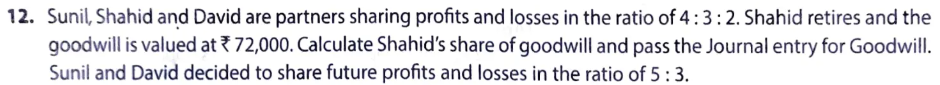 Sunil, Shahid and David are partners sharing profits and losses in the ratio of 4 : 3 : 2. Shahid retires and the goodwill is valued at ₹ 72,000. Calculate Shahid’s share of goodwill and pass the Journal entry for Goodwill. Sunit and David decided to share future profits and losses in the ratio of 5 : 3.
