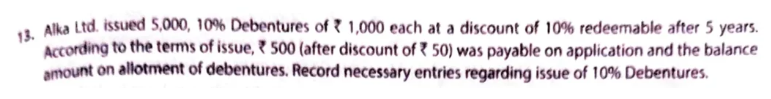 Alka Ltd. issued 5,000, 10% Debentures of ₹ 1,000 each at a discount of 10% redeemable after 5 years. According to the terms of issue, ₹ 500 (after discount of ₹ 50) was payable on application and the balance amount on allotment of debentures. Record necessary entries regarding issue of 10% Debentures.