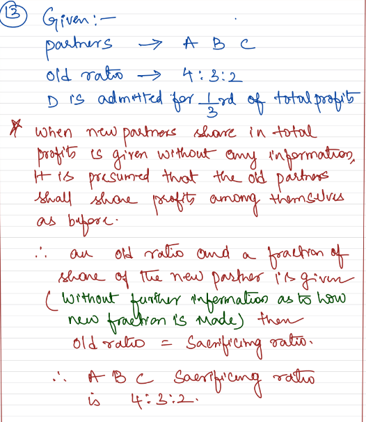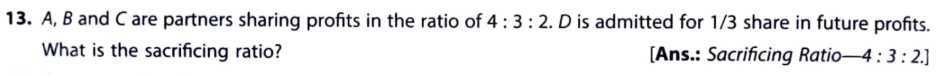 A, B and C are partners sharing profits in the ratio of 4 : 3 : 2. D is admitted for 1/3rd share in future profits. What is the sacrificing ratio?