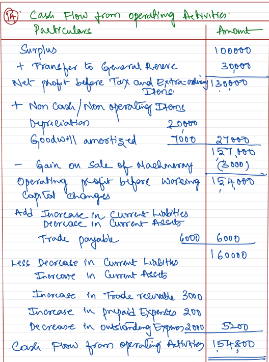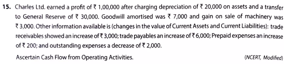 Charles Ltd. earned a profit of ₹ 1,00,000 after charging depreciation of ₹ 20,000 on assets and a transfer to General Reserve of ₹ 30,000. Goodwill amortised was ₹ 7,000 and gain on sale of machinery was ₹ 3,000. Other infromation available is (changes in the value of Current Assets and Current Liabilities): trade receivables showed an increase of ₹ 3,000; trade payables an increase of ₹ 6,000; Prepaid expenses an increase of ₹ 200; and outstanding expenses a decrease of ₹ 2,000. Ascertain Cash Flow from Operating Activities.