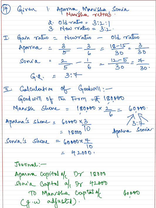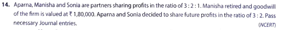Aparna, Manisha and Sonia are partners sharing profits in the ratio of 3 : 2 : 1. Manisha retired and goodwill of the firm is valued at ₹ 1,80,000. Aparna and Sonia decided to share future profits in the ratio of 3 : 2. Pass necessary Journal entries.