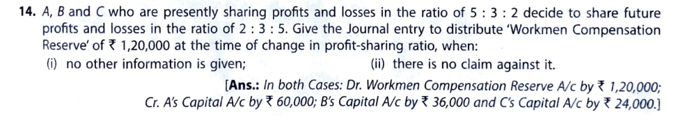A, B and C who are presently sharing profits and losses in the ratio of 5 : 3 : 2 decide to share future profits and losses in the ratio of 2 : 3 : 5. Give the Journal entry to distribute ‘Workmen Compensation Reserve’ of ₹ 1,20,000 at the time of change in profit sharing ratio, when: