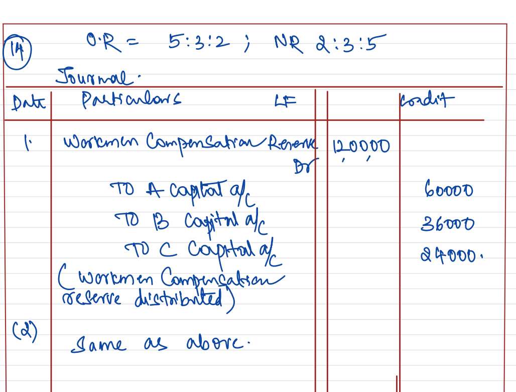 [Ans.: In both Cases: Dr. Workmen Compensation Reserve A/c by ₹ 1,20,000; Cr. A’s Capital A/c by ₹ 60,000; B’s Capital A/c by ₹ 36,000 and C’s Capital A/c by ₹ 24,000.]