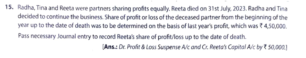 Radha, Tina and Reeta were partners sharing profits equally. Reeta died on 31st July 2022. Radha and Tina decided to continue the business. Share of profit or loss of the deceased partner from the beginning of the year up to the date of death was to be determined on the basis of last year’s profit, which was ₹ 4,50,000. Pass necessary Journal entry to record Reeta’s share of profit/loss up to the date of death.