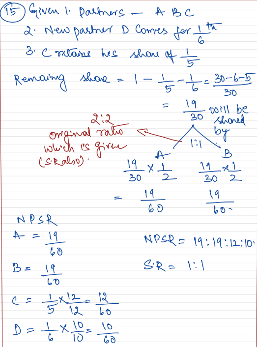 A, B and C are partners sharing profits in the ratio of 2 : 2 : 1. D is admitted as a new partner for 1/6th share. C will retain his original share. Calculate the new profit-sharing ratio and sacrificing ratio.