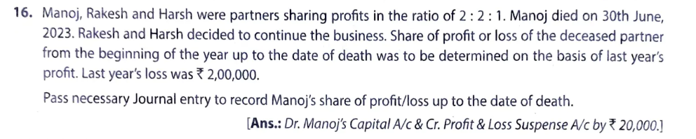 Manoj, Rakesh and Harsh were partners sharing profits in the ratio of 2 : 2 : 1. Manoj died on 30th June, 2022. Rakesh and Harsh decided to continue the business. Share of profit or loss of the deceased partner from the beginning of the year up to the date of death was to be determined on the basis of last year’s profit. Last year’s loss was ₹ 2,00,000.