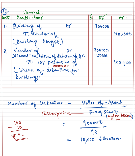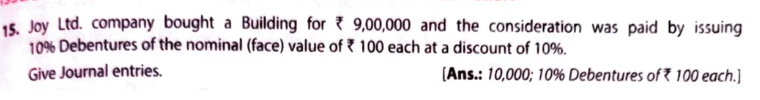 Joy Ltd. company bought a Building for ₹ 9,00,000 and the consideration was paid by issuing 10% Debentures of the nominal (face) value of ₹ 100 each at a discount of 10%.