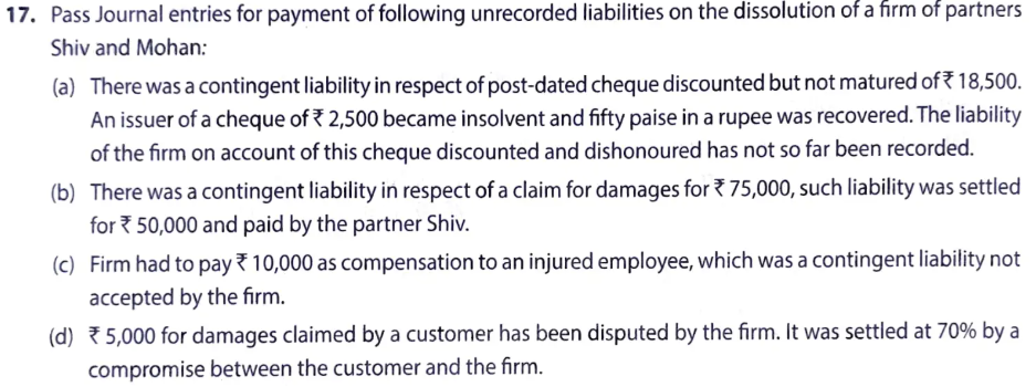 - There was a contingent liability in respect of a claim for damages for ₹ 75,000, such liability was settled for ₹ 50,000 and paid by the partner Shiv.