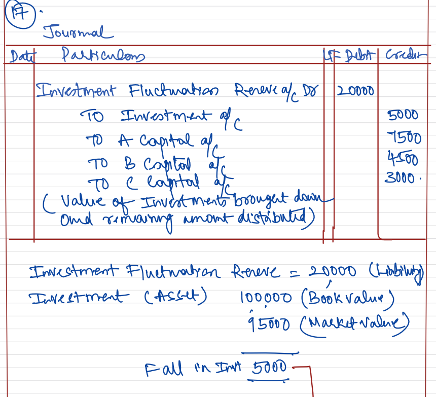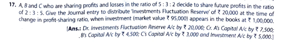 A, B and C who are sharing profits and losses in the ratio of 5 : 3 : 2 decide to share future profits in the ratio of 2 : 3 : 5. Give the Journal entry to distribute ‘Investments Fluctuation Reserve’ of ₹ 20,000 at the time of change in profit sharing ratio, when investment (market value ₹ 95,000) appears in the books at ₹ 1,00,000.