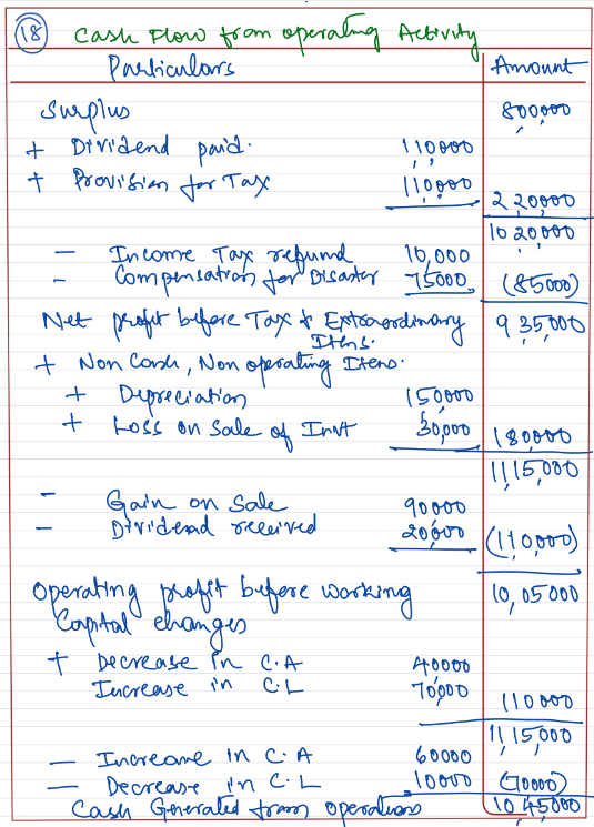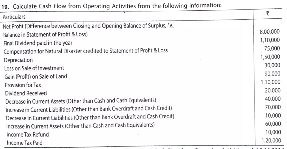 | Net Profit (Difference between Closing and Opening Balance of Surplus, i.e., Balance in Statement of Profit & Loss) Final Dividend paid in the year Compensation for Natural Disaster credited to Statement of Profit & Loss Depreciation Loss on Sale of Investment Gain (Profit) on Sale of Land Provision for Tax Dividend Received Decrease in Current Assets (Other than Cash and Cash Equivalents) Increase in Current Liabilities (Other than Bank Overdraft and Cash Credit) Decrease in Current Liabilities (Other than Bank Overdraft and Cash Credit) |