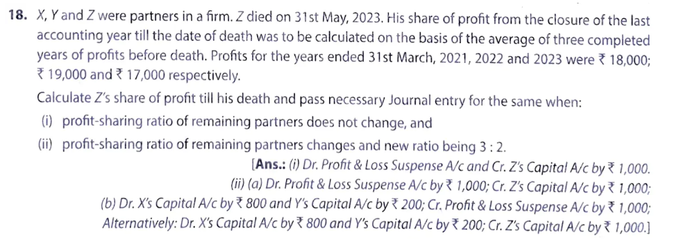 X, Y and Z were partners in a firm. Z died on 31st May, 2022. His share of profit from the closure of the last accounting year till the date of death was to be calculated on the basis of the average of three completed years of profits before death. Profits for the years ended 31st March, 2020, 2021 and 2022 were ₹ 18,000; ₹ 19,000 and ₹ 17,000 respectively.