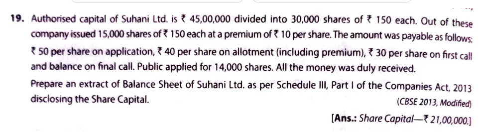 Authorised capital of Suhani Ltd. is ₹ 45,00,000 divided into 30,000 shares of ₹ 150 each. Out of these company issued 15,000 sahres of ₹ 150 each at a premium of ₹ 10 per share. The amount was payable as follows: