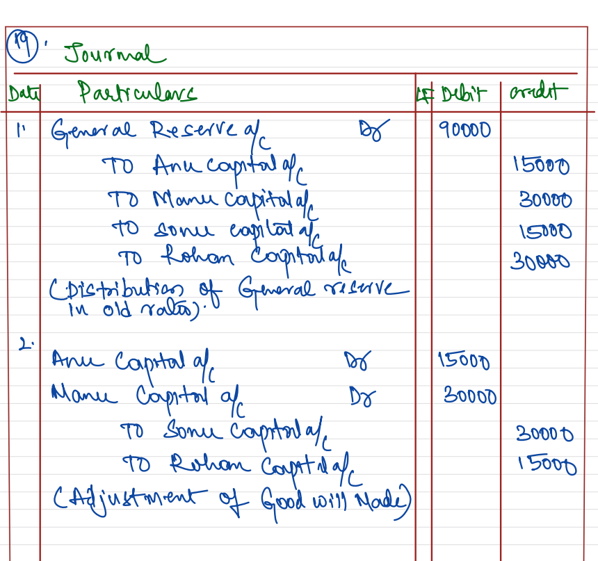 [Ans.: (i) Dr. General Reserve A/c by ₹ 90,000; Cr. Anu’s Capital A/c by ₹ 15,000; Manu’s Capital A/c by ₹ 30,000; Sonu’a Capital A/c by ₹ 15,000; Rohan’s Capital A/c by ₹ 30,000. (ii) Dr. Anu’s Capital A/c by ₹ 15,000; Manu’s Capital A/c by ₹ 30,000; Cr. Sonu’s Capital A/c by ₹ 30,000; Rohan’s Capital A/c by ₹ 15,000. (iii) Anu’s Gain = 1/30; Manu’s Gain = 2/30; Sonu’a Sacrifice = 2/30; Rohan’s Sacrifice = 1/30.]