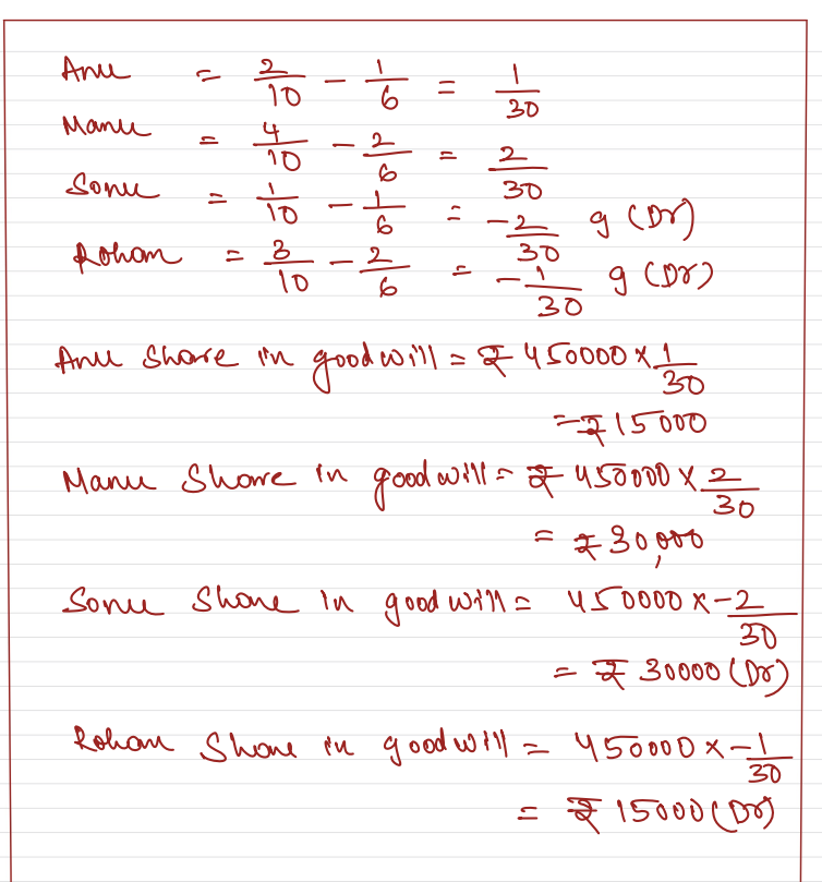 Anu, Manu, Sonu and Rohan were partners in a firm sharing profits and losses in the ratio of 1 : 2 : 1 : 2. with effect from 1st April, 2023, they decided to share profits and losses in the ratio of 2 : 4 : 1 : 3. Their Balance Sheet showed General Reserve of ₹ 90,000. The goodwill of the firm was valued at ₹ 4,50,000.