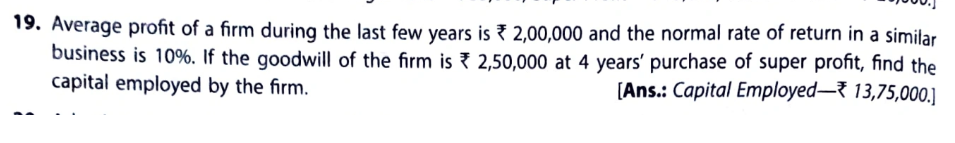 Average Profit of a firm during the last few years is ₹ 2,00,000 and the normal rate of return in a similar business is 10%. If the goodwill of the firm is ₹ 2,50,000 at 4 years’ purchase of super profit, find the capital employed by the firm.