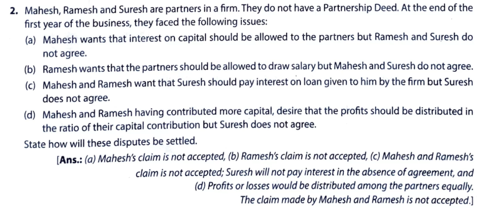 d) Mahesh and Ramesh having contributed larger amounts of capital, desire that the profits should be distributed in the ratio of their capital contribution but Suresh does not agree.