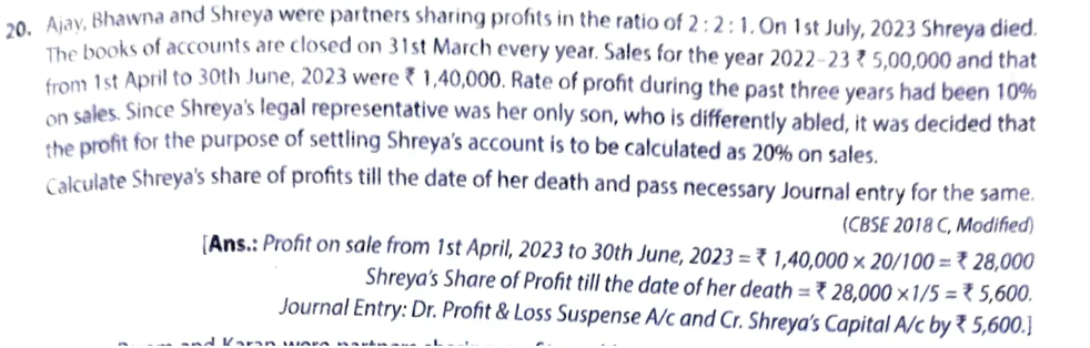 [Ans.: Profit on sale from 1st April, 2022 to 30th June, 2022 = ₹ 1,40,000 × 20/100 = ₹ 28,000 Shreya’s share of Profit till the date of her death = ₹ 28,000 × 1/5 = ₹ 5,600. Journal Entry: Dr. Profit & Loss Suspense A/c and Cr. Shreya’s Capital A/c by ₹ 5,600.]