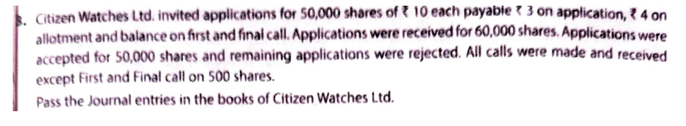 Citizen Watches Ltd. invited applications for 50,000 shares of ₹ 10 each payable ₹ 3 on application, ₹ 4 on allotment and balance on first and final call. Applications were received for 60,000 shares. Application were accepted for 50,000 shares, and the remaining applications were rejected. All call were made and received except First and Final call on 500 shares.