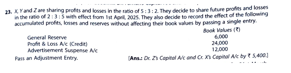 X, Y, and Z are sharing profits and losses in the ratio of 5 : 3 : 2. They decide to share future profits and losses in the ratio of 2 : 3 : 5 with effect from 1st April, 2023. They also decide to record the effect of the following accumulated profits, losses and reserves without affecting their book values by passing a single entry.