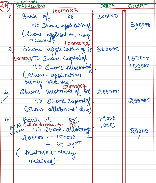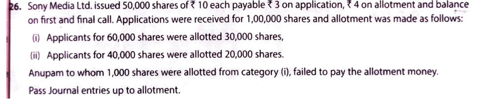 Sony Media Ltd. issued 50,000 shares of ₹ 10 each payable ₹ 3 on application, ₹ 4 on allotment and balance on first and final call. Applications were received for 1,00,000 shares and allotment was made as follows: