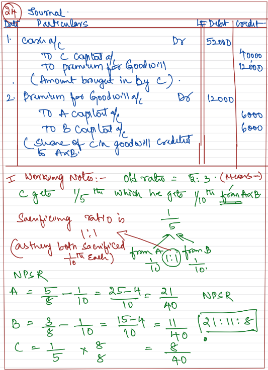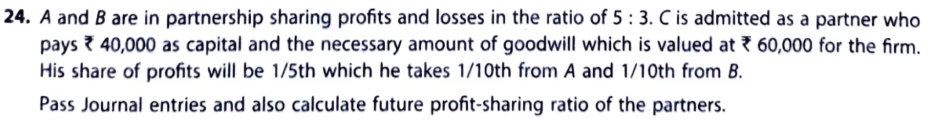 A and B are in partnership sharing profits and losses in the ratio of 5 : 3. C is admitted as a partner who pays ₹ 40,000 as capital and the necessary amount of goodwill which is valued at ₹ 60,000 for the firm. His share of profits will be 1/5th which he takes 1/10th from A and 1/10th from B.