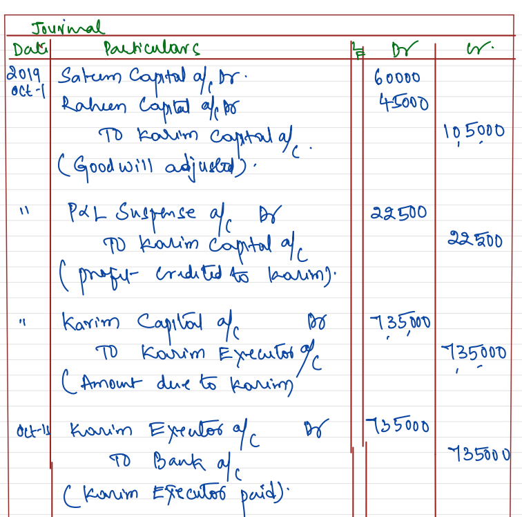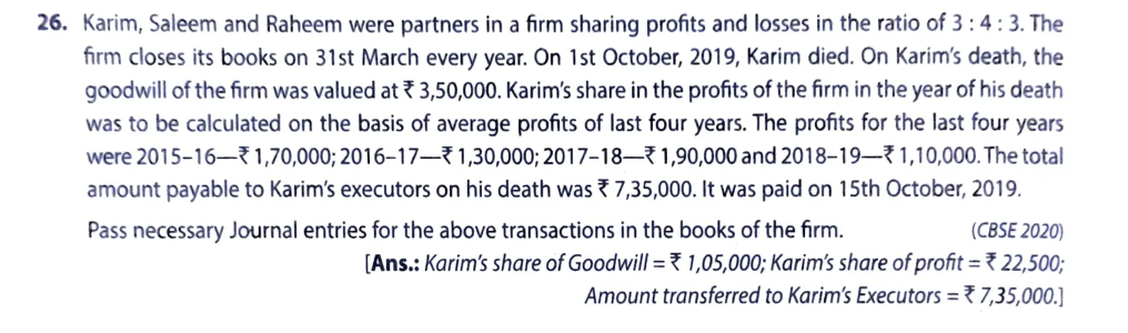 Karim, Saleem and Raheem were partners in a firm sharing profits and losses in the ratio of 3 : 4 : 3. The firm closes its books on 31st March every year. On 1st October, 2019, Karim died. On Karim’s death, the goodwill of the firm was valued at ₹ 3,50,000. karim’s share in the profits of the firm in the year of his death was to be calculated on the basis of average profits of last four years. The profits for the last four years were 2015 – 16 – ₹ 1,70,000; 2016 – 17 – ₹ 1,30,000; 2017 – 18 – ₹ 1,90,000 and 2018-19 – ₹ 1,10,000. The total amount payable to Karim’s executors on his death was ₹ 7,35,000. It was paid on 15th October 2019.