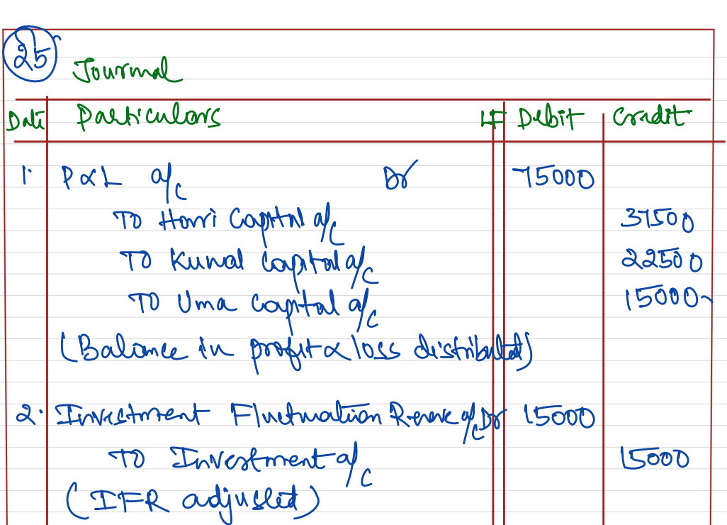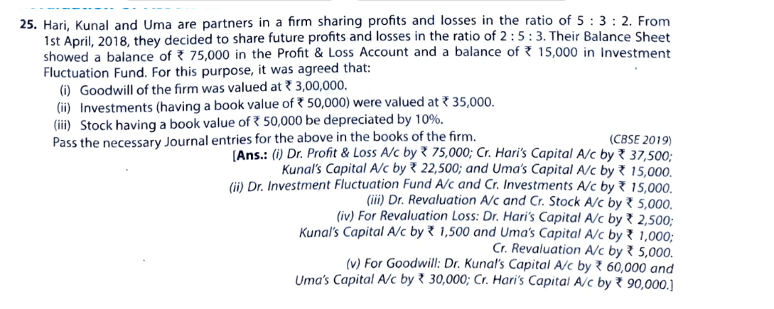 Hari, Kunal and Uma are partners in a firm sharing profits and losses in the ratio of 5 ; 3 : 2. From 1st April 2018 they decided to share future profits and losses in the ratio of 2 : 5 : 3. Their Balance sheet showed a balance of ₹ 75,000 in the Profit and Loss Account and a balance of ₹ 15,000 in investment Fluctuation Fund. For this purpose, it was agreed that: