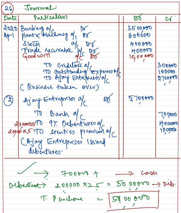 It was decided to pay for purchase consideration as ₹ 7,00,000 through Cheque and balance by issue of 2,00,000, 9% Debentures of ₹ 20 each at a premium of 25%. Journalise.
