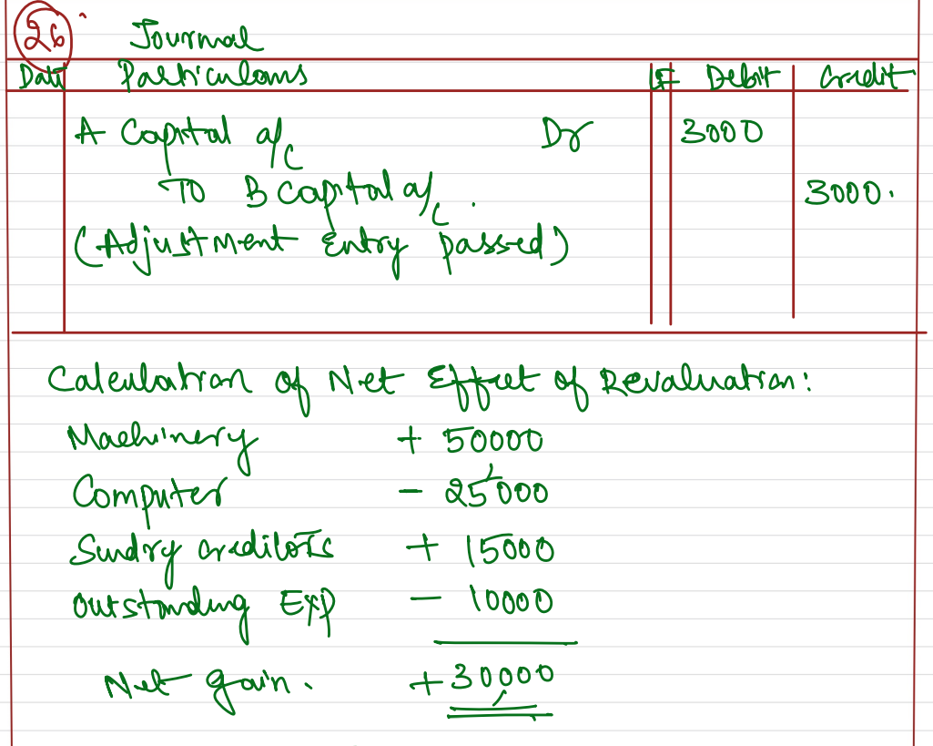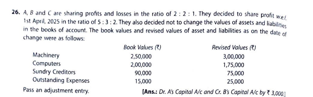 A, B and C are sharing profits and losses in the ratio of 2 : 2 : 1. They decided to share profit w.e.f 1st April, 2023 in the ratio of 5 ; 3 : 2. They also decided not to change the values of assets and liabilities in the books of account. The book values and revised values of asset and liabilities as on the date of change were as follows: