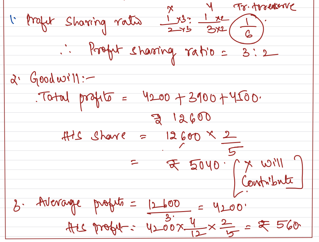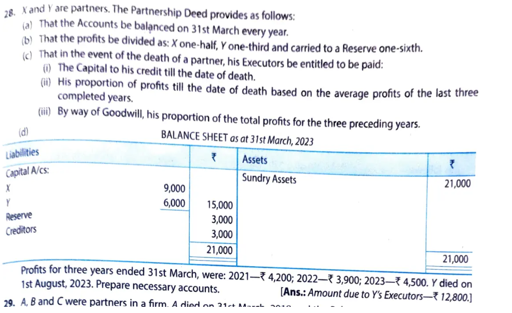 Profits for three years ended 31st March, were: 2021 – ₹ 4,200; 2022 – ₹ 3,900; 2023 – ₹ 4,500. Y died on 1st August, 2023. Prepare necessary accounts.