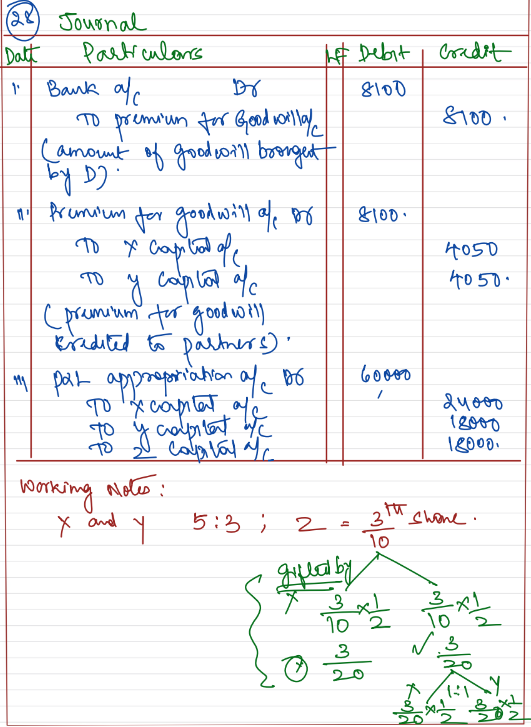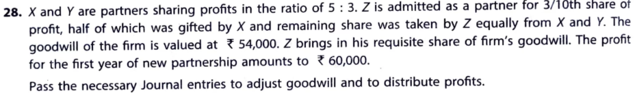 X and Y are partners sharing profits in the ratio of 5 : 3. Z is admitted as a partner for 3/10th share of profit, half of which was gifted by X and remaining share was taken by Z equally from X and Y. The goodwill of the firm is valued at ₹ 54,000. Z brings in his requisite share of firm’s goodwill. The profit for the first year of new partnership amounts to ₹ 60,000.