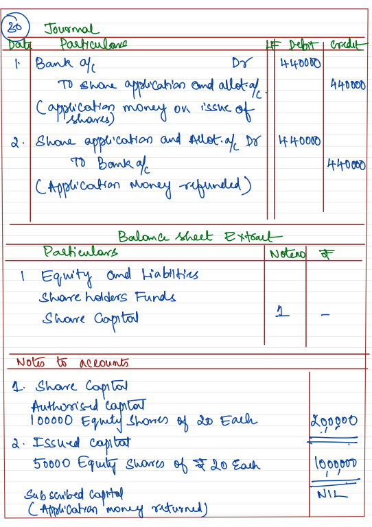 Quality Stationers Ltd. registered with authorised capital of ₹ 20,00,000 divided into 1,00,000 equity shares of ₹ 20 each. 50,000 Equity Shares were issued for subscription at par, issue price being payable along with application. It received application money of ₹ 4,40,000.