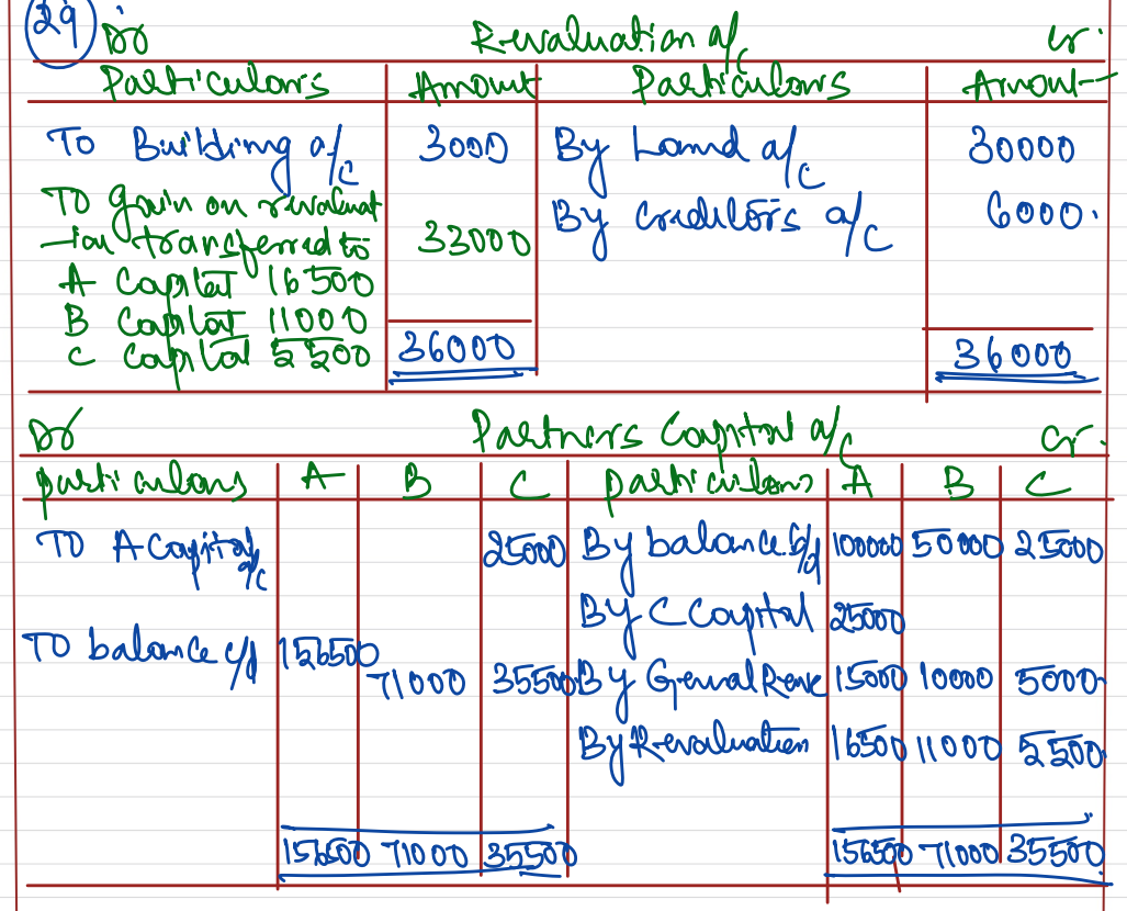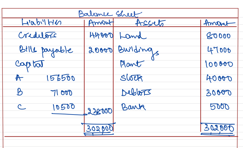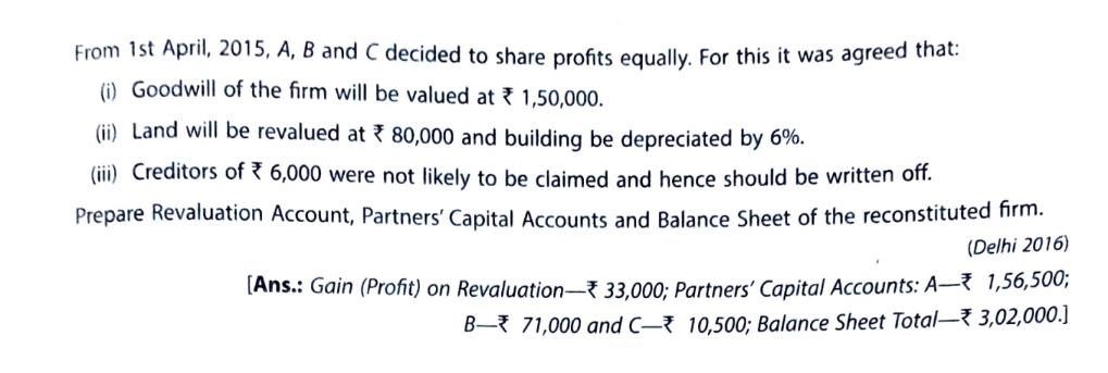 [Ans.: Gain (Profit) on Revaluation – ₹ 33,000; Partner’s Capital Accoufnts: A – ₹ 1,56,000; B – ₹ 71,000 and C – ₹ 10,500; Balance Sheet Total – ₹ 3,02,000.]
