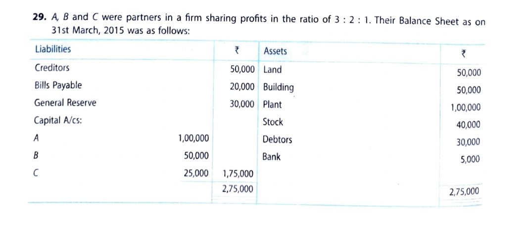 A, B and C were partners in a firm sharing profits in the ratio of 3 : 2 : 1. Their Balance Sheet as on 31st March, 2015 was as follows: